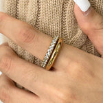 Met haar 18k vergulde basis en fonkelende diamant-simulanten is dit dé ring voor wie houdt van glamour met een verfijnde twist. Draag ’m solo voor een elegante shine of stack ’m voor een bold, layered look.